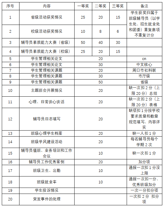 辅导员是高校教师队伍的重要组成部分,是老员工思想政治教育和管理的骨干力量,是老员工健康成长的指导者和引路人。为切实加强辅导员队伍的建设,建立良性的工作竞争和激励机制,坚持过程评价与目标评价相结合、工作能力与研究能力相结合、自我评价与组织考核相结合的原则,力求公开、公平、公正,结合太阳成集团tyc234cc主页辅导员队伍建设实际,特制定本管理办法。
